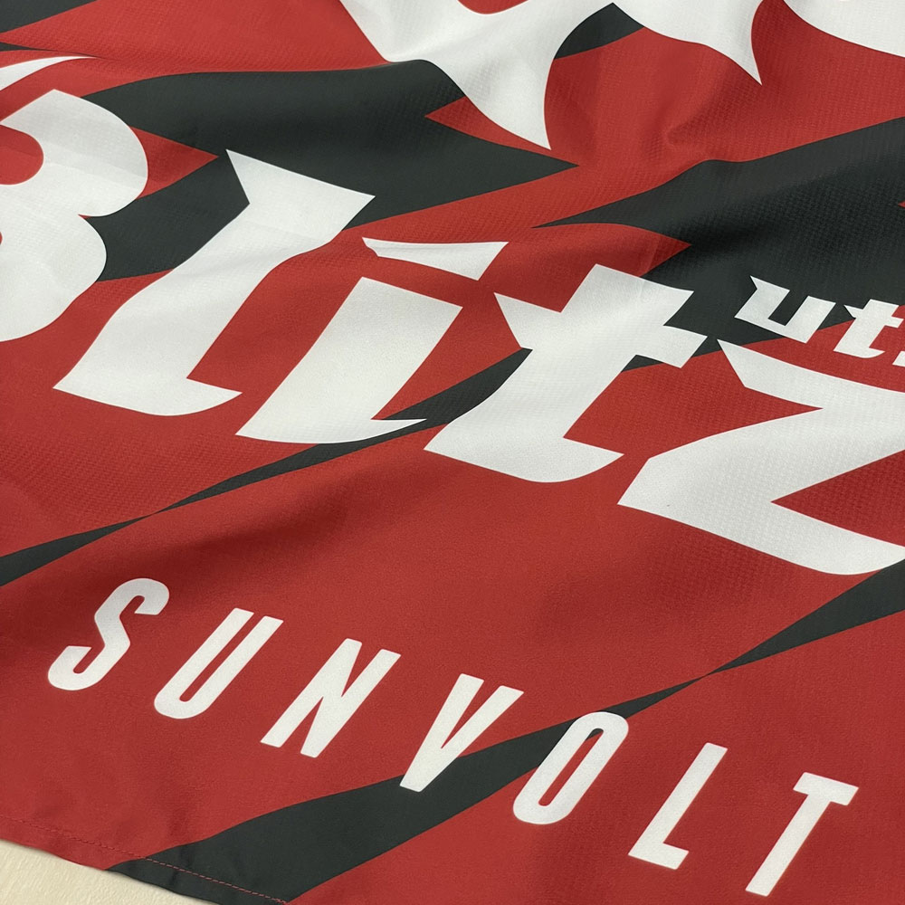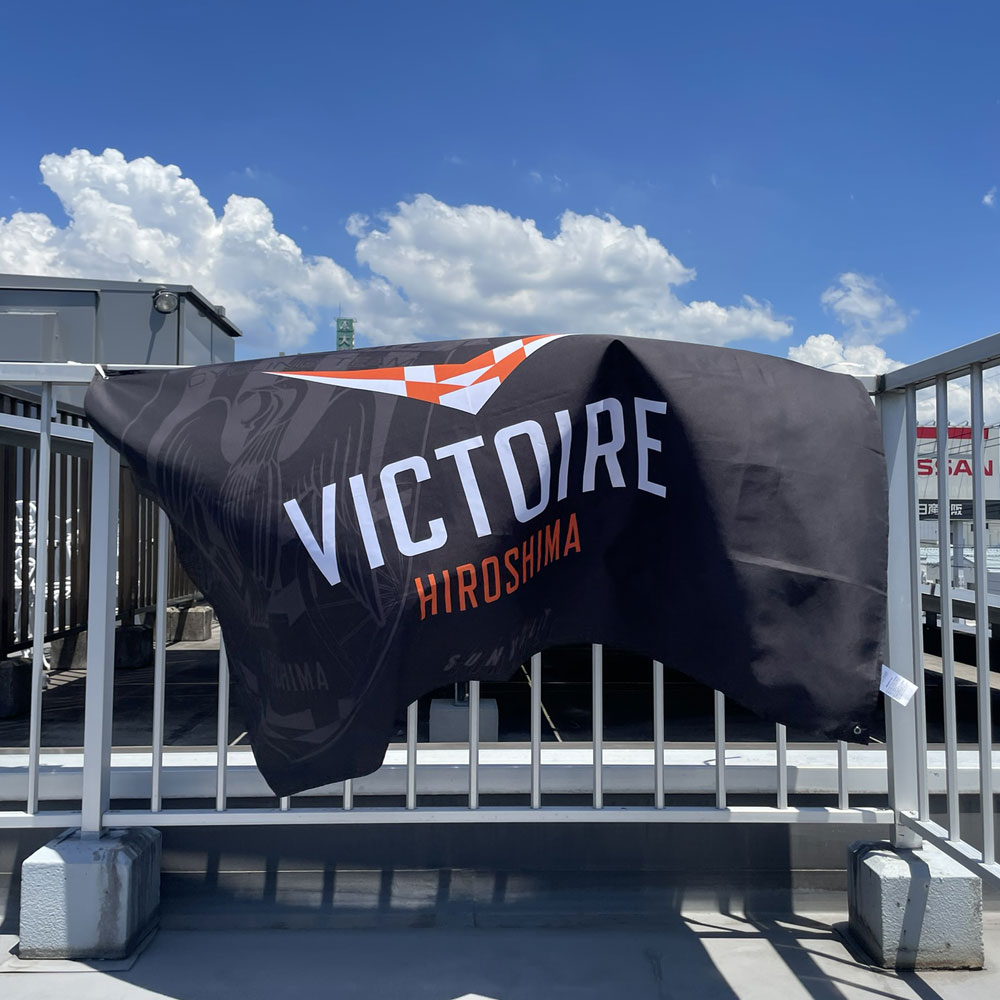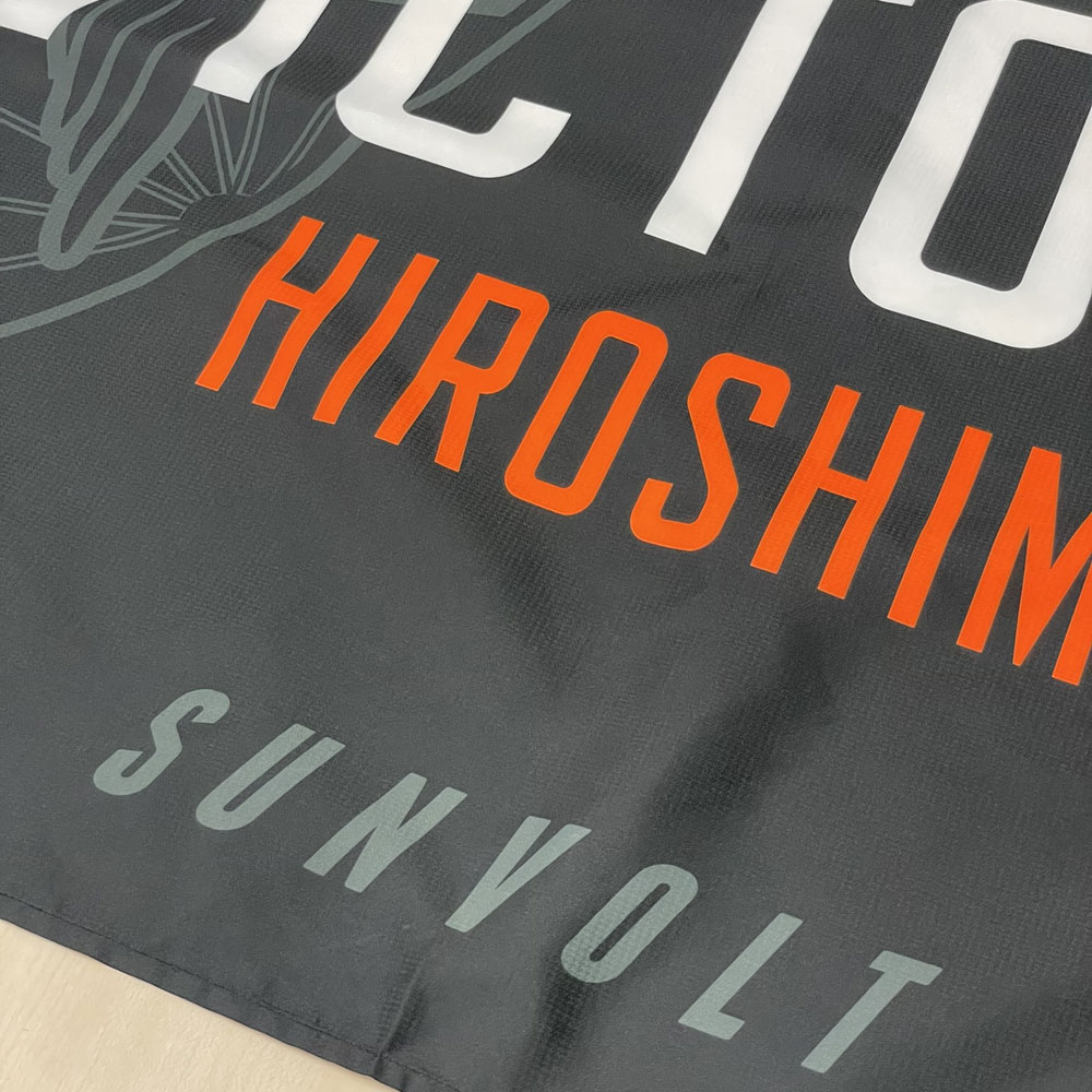 チームの集合写真を彩る、サンボルトのオリジナルチームフラッグ。
