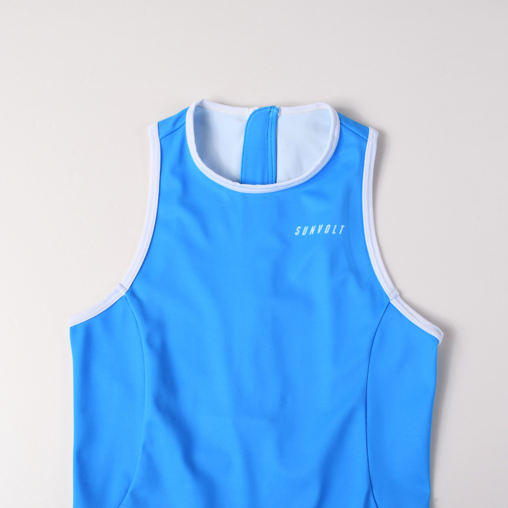 上半身は動きを妨げないノースリーブタイプで、着脱しやすいバックファスナーを採用。